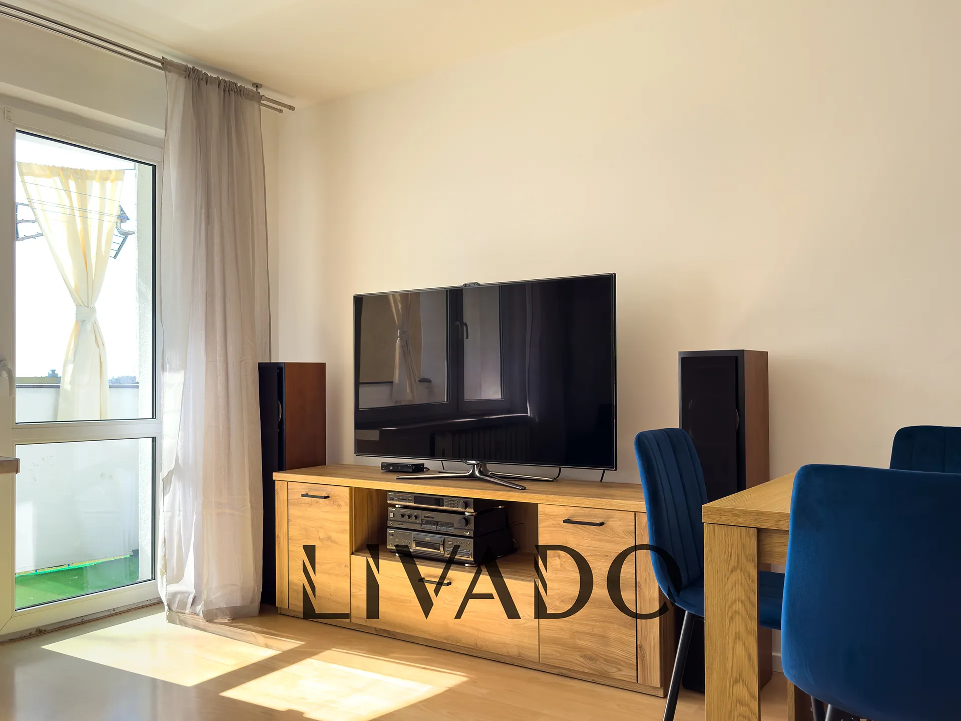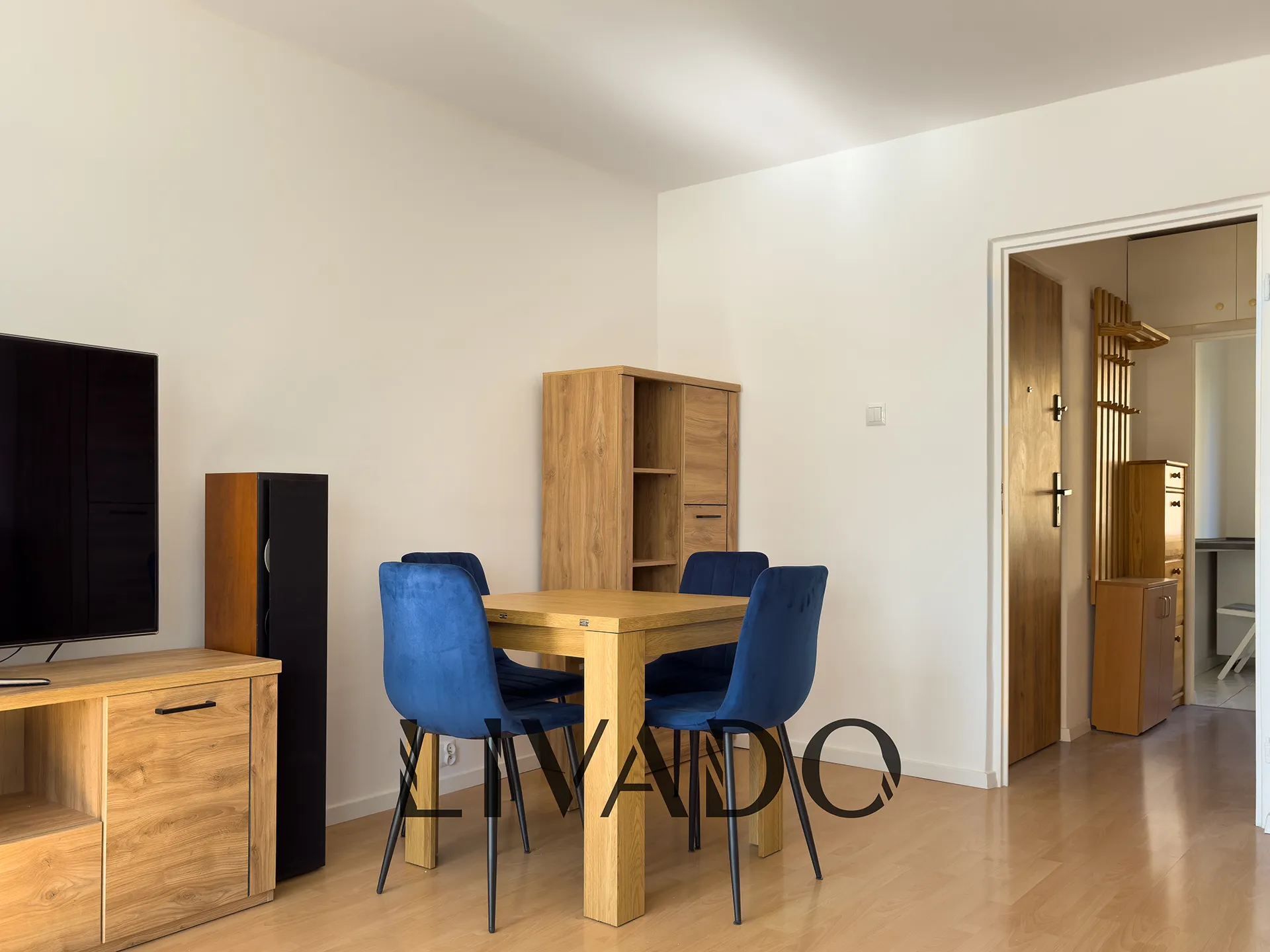 Mieszkanie oferowane jest w pełni umeblowane i wyposażone – do dyspozycji najemcy pozostają łóżko, szafy z zabudową, stół z krzesłami, a także komplet sprzętu AGD: lodówka, pralka, zmywarka oraz kuchenka.